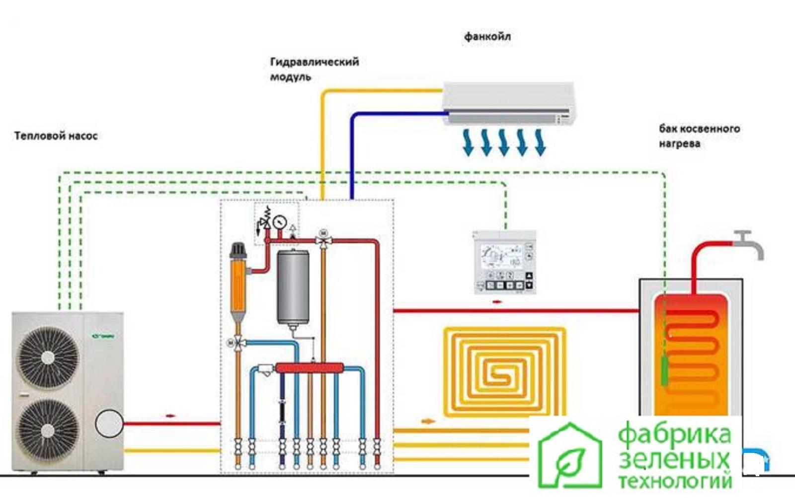 В качестве источника тепла используем тепловые насосы «воздух-вода» . Эти приборы обеспечивают существенное снижение затрат на оплату счетов, по сравнению с традиционными электрическими приборами (конвекторы , ИК-излучатели, электрокотлы) — от 2 до 10 раз! Экономим не только на отоплении, но и на подогреве горячей воды.