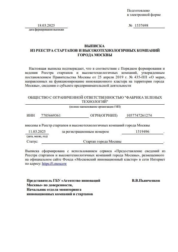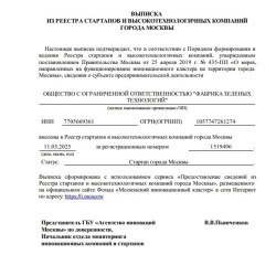 - Предприятие включено в Реестр стартапов и высокотехнологичных компаний города Москвы за № 1519496